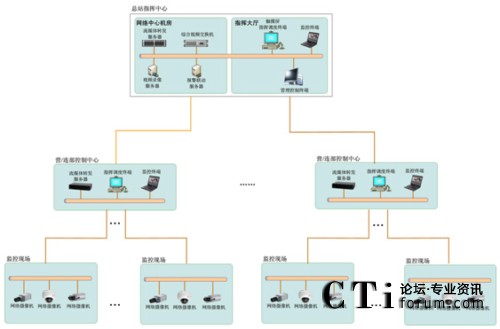 系統(tǒng)采用基于網(wǎng)絡(luò)的分布式控制結(jié)構(gòu),通過通信樓專網(wǎng)連接各機房和各營等現(xiàn)場監(jiān)控點。分為通信樓一級指揮調(diào)度平臺,營二級指揮調(diào)度平臺,結(jié)構(gòu)如下圖。