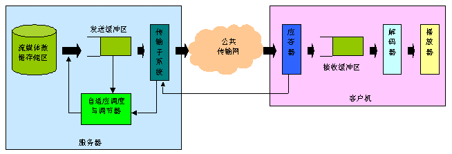 實(shí)時(shí)自適應(yīng)網(wǎng)絡(luò)帶寬的流媒體傳送技術(shù),是上海清鶴數(shù)碼科技公司的一項(xiàng)可大幅提高流媒體寬帶傳送過(guò)程中的關(guān)鍵服務(wù)質(zhì)量瓶頸的國(guó)際技術(shù)專利。我們知道,目前制約流媒體寬帶應(yīng)用發(fā)展的核心問(wèn)題在于服務(wù)質(zhì)量。簡(jiǎn)單地說(shuō),由于因特網(wǎng)的狀況是不可靠的,其帶寬、負(fù)荷等變化劇烈,這難以滿足流媒體寬帶業(yè)務(wù)的實(shí)時(shí)性服務(wù)質(zhì)量要求,并常常造成播放卡殼、延遲、視頻質(zhì)量抖動(dòng)劇烈等不良情況,給使用者感官造成很大影響。所以解決好流媒體寬帶應(yīng)用的服務(wù)質(zhì)量問(wèn)題對(duì)于流媒體寬帶應(yīng)用是極為重要的。如圖1所示,在一般的流媒體寬帶系統(tǒng)里,視頻服務(wù)器通過(guò)網(wǎng)絡(luò)向客戶機(jī)實(shí)時(shí)傳送流媒體信息。