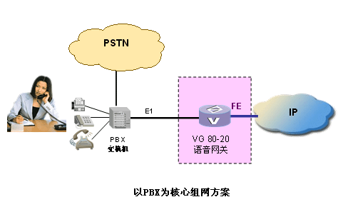 將VG 80-20連接在在PBX和PSTN網(wǎng)之間,使用VG 80-20的一個(gè)E1語音接口連接PSTN,另一個(gè)E1語音接口連接PBX。由語音網(wǎng)關(guān)根據(jù)撥號(hào)策略決定使用PSTN呼叫還是VoIP呼叫,實(shí)現(xiàn)自動(dòng)選路功能。這樣可以在撥號(hào)方式和電話號(hào)碼也不需要作任何改變的情況下,實(shí)現(xiàn)長(zhǎng)途旁路IP電話功能。