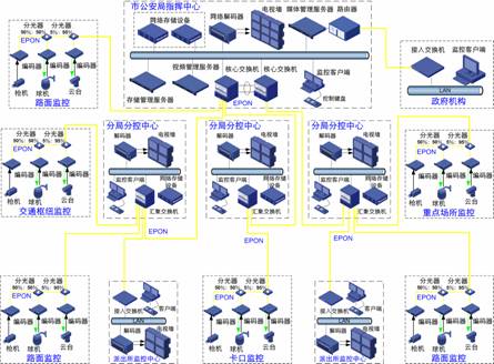 一般說來,城市監(jiān)控系統(tǒng)的網(wǎng)絡(luò)承載平臺要求建設(shè)專網(wǎng)或者VPN網(wǎng)絡(luò)。對于光纖資源較為豐富的城區(qū),可以使用數(shù)字SFP光纖接入,一個前端攝像頭對應(yīng)一條光纖;在光纖資源較少的區(qū)域,可以使用EPON(無源光網(wǎng)絡(luò))技術(shù),一芯光纖上可以同時接入多個前端攝像頭,大量節(jié)約了光纖資源和光纖租用成本;對于較為復(fù)雜的環(huán)境,不適合進(jìn)行布線,可以采用無線接入的方式,降低施工成本。