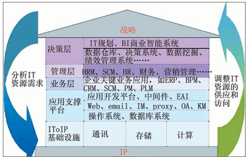 按照華為3Com的構(gòu)想,如果把整個(gè)IT系統(tǒng)比做一座房屋,那么整個(gè)房屋的地基就是IP網(wǎng)絡(luò),需要基于IP網(wǎng)絡(luò)來構(gòu)建通信、存儲(chǔ)、計(jì)算等IT基礎(chǔ)設(shè)施。在這些基礎(chǔ)設(shè)施之上,則是應(yīng)用支撐平臺(tái)(操作系統(tǒng)、數(shù)據(jù)庫系統(tǒng)、應(yīng)用開發(fā)平臺(tái)等),基于應(yīng)用支撐平臺(tái)提供給機(jī)構(gòu)的關(guān)鍵業(yè)務(wù)流程信息系統(tǒng)(如ERP、SCM等),最終為用戶的管理和決策提供支持!霸趹(zhàn)略與IT基礎(chǔ)設(shè)施之間實(shí)現(xiàn)實(shí)時(shí)同步互動(dòng),IT為用戶高層提供商業(yè)智能系統(tǒng)、決策系統(tǒng),以便決策層即時(shí)掌握信息,作為機(jī)構(gòu)戰(zhàn)略決策、戰(zhàn)略挑戰(zhàn)的依據(jù);用戶可以依據(jù)內(nèi)、外部變化,進(jìn)行戰(zhàn)略調(diào)整時(shí)快速分析新的IT資源需求,同步調(diào)整IT資源的配置,從而使IT與業(yè)務(wù)戰(zhàn)略保持同步!边@正是IToIP的基本理念。