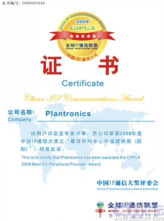 在近日結(jié)束的CIPCA2008年度中國(guó)IP通訊大獎(jiǎng)評(píng)選中,繽特力(Plantronics) 榮獲“最佳呼叫中心外設(shè)提供商(國(guó)際類)”稱號(hào)。