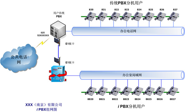 該用戶購(gòu)買eTalk iPBX系統(tǒng)一套,設(shè)置于其所屬開發(fā)中心機(jī)房,利用現(xiàn)存辦公室局域網(wǎng)布設(shè)分機(jī)。通過E1板卡與原有傳統(tǒng)PBX連接,實(shí)現(xiàn)與傳統(tǒng)PBX分機(jī)用戶之間的互相撥打。傳統(tǒng)PBX分機(jī)用戶同時(shí)也能享受eTalk
