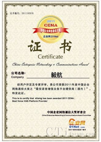 CTI論壇(ctiforum)10月31日消息(記者 潘婷婷): 10月20日,在上海舉行的展覽會上,廣州市毅航通信技術有限公司摘取了(國內(nèi))最佳語音增值業(yè)務平臺提供商的獎,體現(xiàn)了廣州市毅航通信技術有限公司在語音增值方面的市場領先地位。