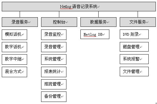 NetLog語音記錄系統(tǒng)采用基于分布式、多層控制管理體系的設計思想,將電話線路與內(nèi)部網(wǎng)絡有效地結合在一起,形成一套完整的語音記錄、管理系統(tǒng)。NetLog系統(tǒng)包括數(shù)據(jù)服務、文件服務、記錄服務、控制臺;