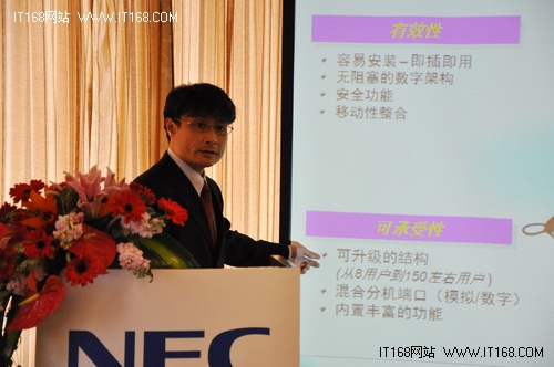 2011年3月28日,國際通信行業(yè)巨頭日本電氣株式會社(以下簡稱NEC公司)在北京舉辦新品發(fā)布會,宣布最新智能通訊服務(wù)器SL1000正式上市。發(fā)布會上,NEC公司IT網(wǎng)絡(luò)國際解決方案組平臺事業(yè)部副總裁橋沢太一郎先生闡述了對未來中國市場的市場策略和遠(yuǎn)景目標(biāo)。