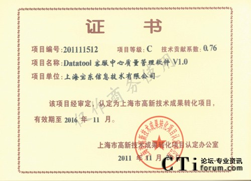 CTI論壇(ctiforum)12月7日消息(記者 張潔):2011年的最后一個(gè)月,寶東公司傳來又一好消息,公司的開發(fā)團(tuán)隊(duì)自主開發(fā)研制的針對(duì)呼叫中心客服的質(zhì)檢軟件“Datatool 客服中心質(zhì)量管理軟件(簡(jiǎn)稱DTQM)”經(jīng)過市高新技術(shù)轉(zhuǎn)化項(xiàng)目認(rèn)定辦公室層層審報(bào)審批,最終經(jīng)審定,被認(rèn)定為市高新技術(shù)成果轉(zhuǎn)化項(xiàng)目。
