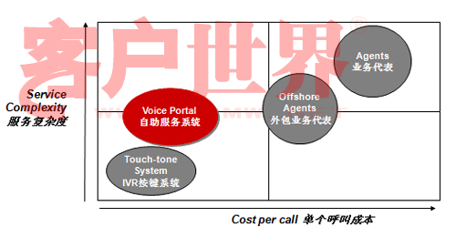 讓我們來看看這張圖。這張圖縱軸是服務(wù)的復(fù)雜度,橫軸是單位呼叫成本,傳統(tǒng)的IVR(觸鍵的語音IVR)和人工服務(wù)相比,服務(wù)的復(fù)雜度可就差多了。而Voice Portal的概念是用比較少的成本做更多的業(yè)務(wù),從成本上講比原來的傳統(tǒng)的IVR可能成本稍微高一點點,但是和人工服務(wù)相比,無論是和單位自建呼叫中心座席比,還是和外包呼叫中心座席比,成本都有很大降低,但業(yè)務(wù)復(fù)雜度可以做得比傳統(tǒng)IVR復(fù)雜很多。我們承認(rèn),就提供服務(wù)的內(nèi)容來講,Voice Portal今天仍然不能夠像人工那樣提供那么全面的服務(wù),但是可以涵蓋很多服務(wù)內(nèi)容,在這方面一是因為技術(shù)先進(jìn)了,另一方面也在于引導(dǎo)。今天我看到越來越多的客戶已經(jīng)開始有意識的推行自助服務(wù)形式。我前幾年去新加坡打出租,發(fā)現(xiàn)在新加坡有很多叫出租的車站,車站上有一個按鍵,按鍵上有一個編碼,說明你在什么位置,當(dāng)你打通出租車客服的電話,你只要告訴這個編碼,他們就自然而然知道你在什么地方,并把要來接你的車車牌號通過語音報讀方式通知你。今天在中國也開始有這種形式了。昨天我沒有開車,也算是支持北京市每周少開一天車的號召,我打了出租,在和出租司機(jī)聊天的過程中,出租司機(jī)說現(xiàn)在油價很貴,他們有很強(qiáng)烈的需求不愿意掃馬路,他們也有一個出租車叫車電話,那個呼叫中心大概有上百個坐席,這個公司有一萬六千輛出租車在北京,由他們來進(jìn)行搶答,搶答完之后你可以告訴說這個人在什么地方等,唯一不同的我們在自助化上還沒有做得那么到位,司機(jī)搶到了活還要給客戶打一個電話,不象新加坡完全是自助的,你只要按了那個鍵,系統(tǒng)就知道你在什么地方,當(dāng)尋找到合適的車的時候,語音報讀你車牌號就行了。我和說出租車師傅,那你打電話成本不是增加了嗎,他一笑,增加打一個電話的成本怎么也比掃馬路強(qiáng)。大家可以看看呼叫中心多有用,自助服務(wù)能省多少錢。