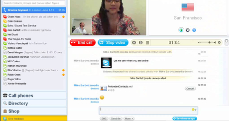 顯著的一個(gè)大改變是,軟件界面變成了全屏,而視頻窗口又占據(jù)了絕大部分版面。在視頻中還有“畫(huà)中畫(huà)”的功能,小的畫(huà)面可以任意移動(dòng)。可以說(shuō)skype從一部網(wǎng)絡(luò)電話,變成了一部網(wǎng)絡(luò)可視電話;蛘,好像感覺(jué)是在視頻聊天室中一樣。