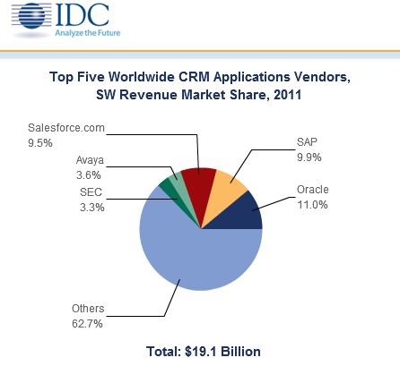 根據(jù)IDC的調(diào)查數(shù)據(jù)顯示,目前就CRM市場來說,Salesforce和SAP正呈現(xiàn)出一種超越甲骨文,奪取領(lǐng)頭羊?qū)氉内厔荨?br />