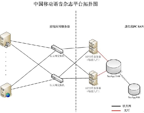 其中,NetApp FAS3140 配有 6 個 450GB 的 FC 磁盤和兩個 300GB FC 磁盤,裸容量為 46TB,用于運行中國移動的語音雜志業(yè)務,采用 Socket 連接。NetApp FAS2050 則內置有 12 塊1TB SATA 磁盤,裸容量為 12TB,主要用于測試高陽公司 Oracle 數據庫和網站應用等。