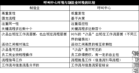 在呼叫中心的環(huán)境下,業(yè)務(wù)流程的類型主要是“Workflow”。但在流水作業(yè)的制造業(yè)環(huán)境下,“Work process”則是主要的類型。再也清楚不過了:這兩種工作現(xiàn)場(chǎng)環(huán)境是很不一樣的。