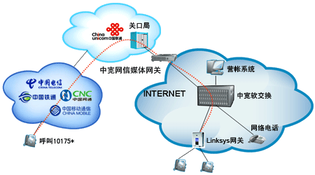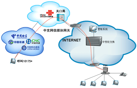 企業(yè)或個人自行從網(wǎng)站上成功申請“企業(yè)商務(wù)通”或“個人隨身行”業(yè)務(wù)后,通過101756*全國統(tǒng)一接入號結(jié)合中寬網(wǎng)信推薦的思科linksys網(wǎng)關(guān)或網(wǎng)絡(luò)電話使用,當外部對您申請的10175*號碼發(fā)起呼叫時,該呼叫通過中國聯(lián)通的線路將話務(wù)指向中寬網(wǎng)信的媒體網(wǎng)關(guān),由中寬軟交換平臺將呼叫送至您指定的電話上。另外,當您使用該業(yè)務(wù)外呼時,可以選擇在被叫電話上顯示10175*或隱藏號碼。