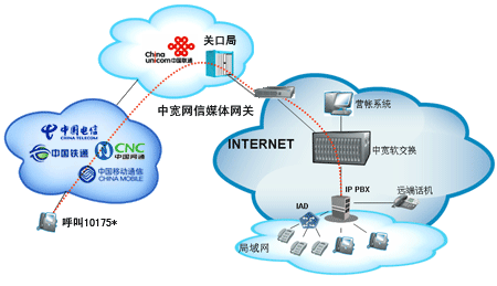 企業(yè)自行從網(wǎng)站上成功申請“企業(yè)商務(wù)通” 業(yè)務(wù)后,通過101756*全國統(tǒng)一接入號后結(jié)合中寬網(wǎng)信推薦的IPPBX,當外部對企業(yè)申請的10175*號碼發(fā)起呼叫時,該呼叫通過中國聯(lián)通的線路將話務(wù)指向中寬網(wǎng)信的媒體網(wǎng)關(guān),由中寬軟交換平臺將呼叫送至指定的IP PBX上,由IP PBX接續(xù)至總臺或相應(yīng)分機。另外,當您使用該業(yè)務(wù)外呼時,可以選擇在被叫電話上顯示10175*或隱藏號碼。