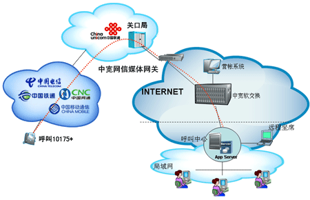 企業(yè)自行從網(wǎng)站上成功申請“企業(yè)商務(wù)通”業(yè)務(wù)后,通過101756*全國統(tǒng)一接入號結(jié)合呼叫中心,當外部對企業(yè)申請的10175*號碼發(fā)起呼叫時,該呼叫通過中國聯(lián)通的線路將話務(wù)指向中寬網(wǎng)信的媒體網(wǎng)關(guān),由中寬軟交換平臺將呼叫送至指定的呼叫中心,由呼叫中心完成相應(yīng)的服務(wù)。另外,當您使用該業(yè)務(wù)外呼時,可以選擇在被叫電話上顯示10175*或隱藏號碼。