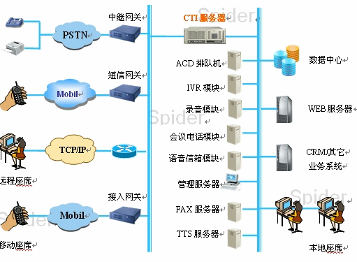 隨著呼叫中心相關(guān)技術(shù)的發(fā)展,呼叫中心的功能日益豐富,其組成結(jié)構(gòu)也日益復(fù)雜。一個(gè)完整的呼叫中心可以認(rèn)為由基本部分和擴(kuò)展部分兩部分組成。呼叫中心的基本組成部分為:自動(dòng)呼叫分配模塊(ACD)、IVR交互式語(yǔ)音應(yīng)答系統(tǒng)、CTI服務(wù)器、錄音、人工座席、班長(zhǎng)席、后臺(tái)管理系統(tǒng)等;擴(kuò)展模塊包括FAX服務(wù)器、web服務(wù)器、email服務(wù)器及語(yǔ)音信箱、會(huì)議電話(huà)等功能。