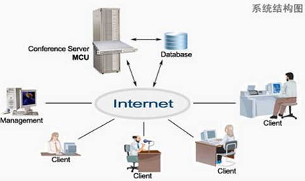 經(jīng)過種種測試,最后選定視維Super-V視頻會議系統(tǒng),山大聯(lián)潤研發(fā)的視維視頻會議系統(tǒng)由服務(wù)器端軟件和客戶端軟件兩部分組成。其中安裝服務(wù)器端軟件的PC服務(wù)器必須有公網(wǎng)固定的IP地址;有較好的網(wǎng)絡(luò)帶寬條件,以保證正常的音視頻信號的傳輸。所有會議成員都需要在其個(gè)人計(jì)算機(jī)上安裝客戶端軟件,可以根據(jù)具體情況接入IP網(wǎng)絡(luò)。視維Super-V視頻會議系統(tǒng)將所參會人員通過IP網(wǎng)絡(luò)連接起來,提供音頻、視頻以及數(shù)據(jù)協(xié)作等通訊服務(wù)。其網(wǎng)絡(luò)拓?fù)鋱D如下: