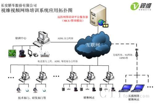 長安轎車大規(guī)模網(wǎng)絡(luò)遠程會議和培訓系統(tǒng)由服務器端和客戶端組成,服務器端軟件部署在重慶中心機房,中心機房配置1臺單獨服務器,支持400個客戶端同時在線,負責所有會議和培訓的召集、音視頻交互、加密等工作,長安轎車各部門、轄下各零售點通過WEB方式(包括ADSL、3G無線等多種網(wǎng)絡(luò))即可實現(xiàn)客戶端軟件的自動安裝與升級,配備簡單的攝像頭和話筒之后就可以實現(xiàn)長安轎車以及400多零售點的大規(guī)模工作會議和高清音視頻網(wǎng)絡(luò)培訓。網(wǎng)絡(luò)拓撲圖如下: