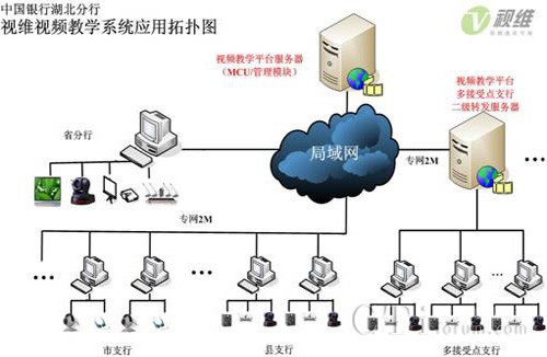 中國銀行湖北分行的視頻教學系統(tǒng)由服務器端和客戶端組成,服務器端軟件部署在省分行中心機房,配置2臺服務器,對于接受點超過5個的分支機構(gòu)配置二級轉(zhuǎn)發(fā)服務器,共支持全省各支行及支行內(nèi)多個客戶端同時在線,負責所有培訓的召集、音視頻交互、加密等工作,各支行通過WEB方式即可實現(xiàn)客戶端軟件的自動安裝與升級,輕松實現(xiàn)實現(xiàn)省分行以及各支行共77余個接受點的高清音視頻視頻教學。同時為中國銀行湖北分行的視頻教學系統(tǒng)配置異構(gòu)兼容模塊,支持與其他視頻會議及軟、硬件視頻教學系統(tǒng)無縫融合,避免重復投資造成的浪費。網(wǎng)絡拓撲圖如下: