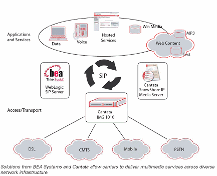 BEA提供領(lǐng)先的SOA基礎(chǔ)架構(gòu),同時(shí)它還提供可以在即使是完全不同的IT環(huán)境中建立應(yīng)用和管理SOA的強(qiáng)大的、 基于標(biāo)準(zhǔn)的平臺(tái)。BEA WebLogic Communications Platform (WebLogic 通信平臺(tái))是第一個(gè)提供在運(yùn)營(yíng)商級(jí)環(huán)境中、全業(yè)務(wù)功能的融合IT和電信的平臺(tái)。它使得運(yùn)營(yíng)商可以通過加強(qiáng)利用固網(wǎng)和無線網(wǎng)開展多樣的數(shù)字內(nèi)容和視頻服務(wù)的能力,從而增加收入。其WebLogic SIP 服務(wù)器提供了必需的呼叫建立和會(huì)話管理,但是,運(yùn)營(yíng)商仍然需要高級(jí)的媒體處理能力,以及能夠與BEA 解決方案進(jìn)行互操作的標(biāo)準(zhǔn)接口,從而使得運(yùn)營(yíng)商可以提供可擴(kuò)展的語音、視頻和多媒體服務(wù)。他們同時(shí)需要有媒體網(wǎng)關(guān)以實(shí)現(xiàn)跨網(wǎng)絡(luò)的連接。Cantata與BEA Systems 合作,提供與BEA的WebLogic SIP服務(wù)器可靠的交互操作性,同時(shí),運(yùn)營(yíng)商可以利用Cantata的SnowShore IP媒體服務(wù)器以及集成媒體網(wǎng)關(guān)1010實(shí)現(xiàn)跨固網(wǎng)和無線網(wǎng)語音和多媒體服務(wù)。