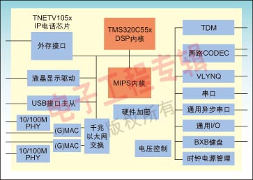 TI提供全面的VoIP解決方案,覆蓋IP電話、家庭網(wǎng)關、電信級網(wǎng)關以及VoADSL和VoCable。針對企業(yè)級IP電話需求,TI提供了多種解決方案,其中TNETV1050/TNEV1055的SoC方案基于TI的TMS320C55x DSP系列的可編程DSP和增強的32位MIPS內核。它使用先進的系統(tǒng)架構,在提供高性能低功耗的同時,兼顧系統(tǒng)的可擴展性,還包括豐富的外設接口,滿足設計企業(yè)級電話系統(tǒng)的要求。
