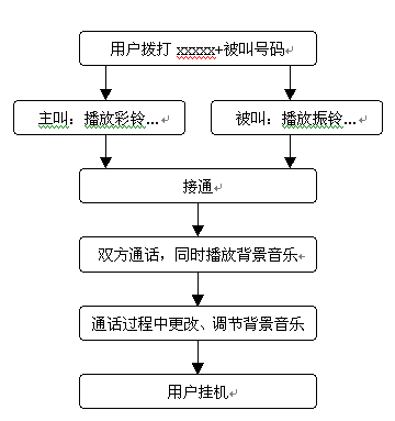 用戶可以撥打本系統(tǒng)特服號xxxxx+被叫電話號碼,使用背景音樂,進入系統(tǒng)后,根據(jù)語音提示的指引,進行添加、修改、定制、刪除背景音樂等操作來管理背景音樂。通話過程中可隨時根據(jù)自己的需要進行按鍵選擇更換背景音樂,主叫用戶還可選擇呼叫第三方、第四方、……進行電話會議式的多人聊天,同時也可以隨時按鍵調(diào)節(jié)背景音樂的音量大小。系統(tǒng)可以設(shè)定九種默認背景音效,分別對應1~9 號按鍵,用戶可以采用默認的慣用音效進行使用。