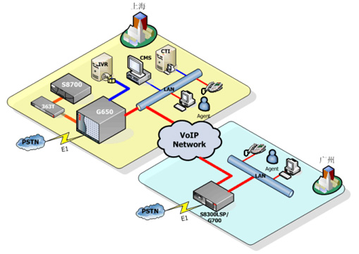 為了進(jìn)一步拓展中國市場,并且針對某些特定的地方需要提供本地化方言服務(wù),S公司需要在廣州設(shè)立一個新的座席集群,座席數(shù)量在50左右,需要擁有與中心點一樣完善的功能,實現(xiàn)呼叫的自由分配,共享中心點設(shè)施,比如CMS(呼叫中心報表系統(tǒng))、IVR(交互式語音應(yīng)答系統(tǒng))和CDR(呼叫詳細(xì)記錄)等等。并提供最強的穩(wěn)定性和冗余備份功能。