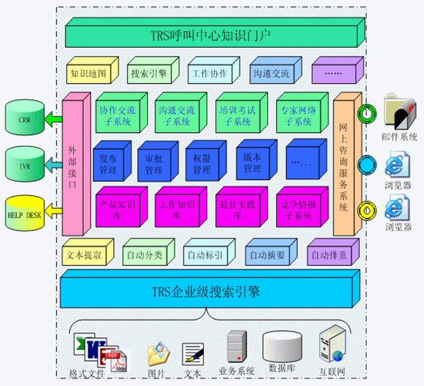 TRS Call Center 知識(shí)管理系統(tǒng)構(gòu)建在TRS企業(yè)級(jí)搜索引擎之上,融合了TRS文本挖掘技術(shù)和內(nèi)容管理技術(shù),全面包括知識(shí)庫、競(jìng)爭(zhēng)情報(bào)、專家網(wǎng)絡(luò)、培訓(xùn)考試、溝通交流和協(xié)作交流六大子系統(tǒng),以及發(fā)布管理、審批管理、權(quán)限管理、版本控制等系統(tǒng)管理模塊;并集成面向用戶的網(wǎng)上咨詢服務(wù)系統(tǒng),提供面向客戶管理信息系統(tǒng)(CRM)、自動(dòng)語音應(yīng)答系統(tǒng)(IVR)、Help
