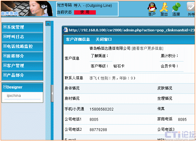當(dāng)客戶來電轉(zhuǎn)接人工服務(wù)時(shí),自動彈出信息登記窗口并根據(jù)來電號碼檢查客戶資料庫中是否有該客戶的數(shù)據(jù)。如客戶的名稱、地址、聯(lián)系電話、身體狀況、膚色、以往的咨詢、投訴等記錄信息。以及來電日期、時(shí)間、受理人等;使座席人員一目了然,第一時(shí)間了解來電的相關(guān)信息。