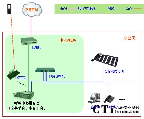 維佳元創(chuàng)呼叫中心系統(tǒng)采用暢信達通信呼叫中心交換平臺與業(yè)務平臺,采用1路E1數(shù)字中繼線接入,對外公布一個400號碼與10多個辦公電話號碼,采用IP話機作為總臺調度電話、座席電話與辦公電話,系統(tǒng)架構形式如下: