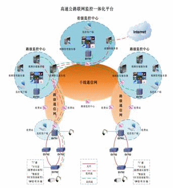 采用H.264編碼標(biāo)準(zhǔn)的EV702外場綜合接入設(shè)備,將原來外場分散的攝像頭、快球、云臺(tái)、可變情報(bào)板、報(bào)警感應(yīng)器等設(shè)備融為一體,同時(shí)也支持MPEG編碼標(biāo)準(zhǔn)的視音頻接入。EV702配備光纖通信板卡,不需要光端機(jī),可以直接連接光纖,進(jìn)行遠(yuǎn)距離。通過EV702連接成環(huán),并且具有自愈功能?蛇M(jìn)行集中式(路級(jí)監(jiān)控中心)、分布式(各級(jí)監(jiān)控中心)存儲(chǔ)。路級(jí)中心、區(qū)域中心、省級(jí)中心分布式多級(jí)監(jiān)控,由省中心統(tǒng)一設(shè)定權(quán)限,進(jìn)行集中管理。