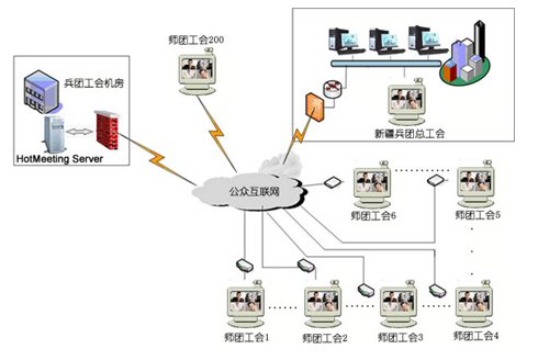 新疆建設(shè)兵團(tuán)工會(huì)下設(shè)有14個(gè)師工會(huì),111個(gè)團(tuán)場(chǎng)工會(huì).共有200個(gè)用戶同時(shí)參加視頻會(huì)議。中心服務(wù)器帶寬為100M光纖,各地終端通過(guò)網(wǎng)通2M寬帶接入,每個(gè)師、團(tuán)級(jí)會(huì)場(chǎng)都有自己獨(dú)立的機(jī)房和會(huì)議室,適合進(jìn)行基于IP網(wǎng)絡(luò)視訊會(huì)議的應(yīng)用,在這個(gè)網(wǎng)絡(luò)平臺(tái)上,優(yōu)視(URSACOM)HotMeeting富媒體視頻會(huì)議系統(tǒng)所提供的高質(zhì)量的視頻圖像和方便易用的文檔、文件共享功能,使得兵團(tuán)工會(huì)領(lǐng)導(dǎo)能夠在這個(gè)平臺(tái)上進(jìn)行從桌面討論到會(huì)議室正式會(huì)議等各種規(guī)模應(yīng)用。通過(guò)HotMeeting富媒體視頻會(huì)議系統(tǒng),除了進(jìn)行全團(tuán)工會(huì)系統(tǒng)例會(huì),工作交流等常見的應(yīng)用之外,遠(yuǎn)程培訓(xùn)等也是經(jīng)常進(jìn)行的內(nèi)容。各個(gè)師、團(tuán)工會(huì)系統(tǒng)能利用數(shù)據(jù)功能和兵團(tuán)總工會(huì)協(xié)調(diào)業(yè)務(wù),也能把平常培訓(xùn)的會(huì)議材料進(jìn)行詳細(xì)介紹,節(jié)約了以前培訓(xùn)所花費(fèi)的大量精力和時(shí)間。具體網(wǎng)絡(luò)拓?fù)湟娤聢D: