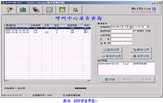 NetVoice作為3Com NBX網(wǎng)絡(luò)電話產(chǎn)品中國區(qū)總分銷,在積累大量3Com IPCC開發(fā)應(yīng)用經(jīng)驗(yàn)的基礎(chǔ)上,通過對3Com NBX產(chǎn)品技術(shù)特性的詳盡分析,并結(jié)合其它錄音產(chǎn)品的成功開發(fā)經(jīng)驗(yàn),成功的在3Com