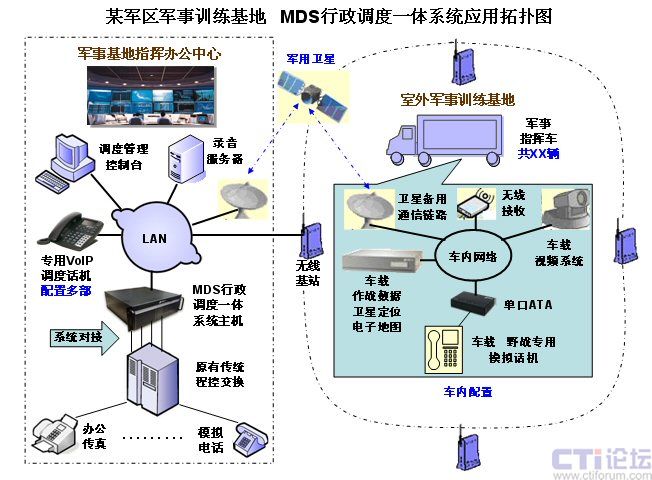 為了加強(qiáng)現(xiàn)代化軍隊(duì)的建設(shè),某軍區(qū)在其軍分區(qū)的指揮訓(xùn)練基地,使用先進(jìn)的技術(shù),搭建了一套由幾十輛軍事指揮車組成的作戰(zhàn)指揮訓(xùn)練系統(tǒng),其中的語音通信指揮系統(tǒng)部分,采用了美國(guó)Zed-3公司最先進(jìn)的基于IP技術(shù)的MDS80行政調(diào)度一體化通信系統(tǒng),解決了訓(xùn)練基地的指揮中心大樓的原有通信系統(tǒng),與室外的訓(xùn)練基地各輛指揮車之間,通過基地?zé)o線網(wǎng)絡(luò)及衛(wèi)星備份鏈路提供的IP通道,實(shí)現(xiàn)語音的指揮調(diào)度通信,達(dá)到訓(xùn)練基地要求的最佳的語音指揮調(diào)度通信效果。