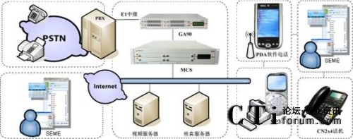 1)由MCS與該企業(yè)原有的大型傳統(tǒng)PBX進(jìn)行對接,MCS主要處理語音交換,具備IP-PBX和VOIP網(wǎng)關(guān)的功能,還具有IVR(交互式語音應(yīng)答)和ACD(自動(dòng)呼叫分配)等呼叫中心功能,并為SEME提供服務(wù)。