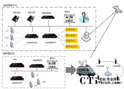 構(gòu)成2:-移動指揮中心(指揮車通信系統(tǒng)):該系統(tǒng)與地面指揮中心一樣部署一整套調(diào)度系統(tǒng)(調(diào)度主機、調(diào)度臺軟件、中繼網(wǎng)關(guān)、集群網(wǎng)關(guān)、衛(wèi)星接收設(shè)備等),當(dāng)移動指揮車在外工作時,可實現(xiàn)單獨的指揮調(diào)度工作,各不同系統(tǒng)(數(shù)字集群/短波/常規(guī)對講等)的終端人員也可通過調(diào)度機實現(xiàn)互相通信。