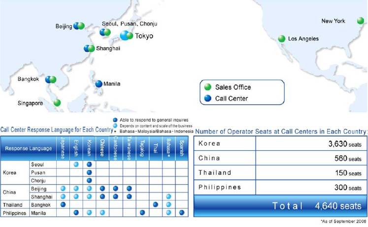 transcosmos于1989年在美國(guó)建立了海外分部并于2001年開始進(jìn)軍亞洲的海外市場(chǎng)提供呼叫中心和數(shù)碼營(yíng)銷服務(wù)。Transcosmos在呼叫中心服務(wù)上共投資450,000,000日元而且在6個(gè)國(guó)家的10所城市發(fā)展了本地的呼叫中心服務(wù)。同時(shí),transcosmos為了滿足客戶促進(jìn)業(yè)務(wù)發(fā)展的需求,在亞洲各國(guó)戰(zhàn)略性地設(shè)置了執(zhí)行官以及總監(jiān)級(jí)別的管理層,也建立了可以提供10種主要亞洲語言的構(gòu)架。通過transcosmos多樣分部的統(tǒng)一管理,提高了服務(wù)質(zhì)量并且在不斷累積的業(yè)務(wù)訣竅和知識(shí)上達(dá)到業(yè)務(wù)效能。