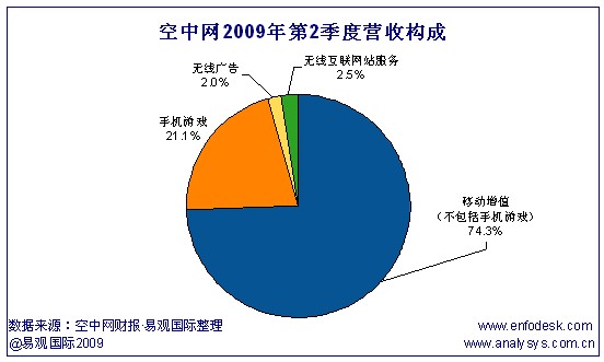 空中網(wǎng)2009年第2季度總營(yíng)收為3230萬美元,其中總無線增值服務(wù)(不包括手機(jī)游戲)營(yíng)收為2393萬美元,同比增長(zhǎng)10%,比上一季度增長(zhǎng)1%,占總營(yíng)收的74.09%;手機(jī)游戲占總營(yíng)收的21.05%,比上一季度增長(zhǎng)38%;這一季度,空中網(wǎng)將無線廣告和無線互聯(lián)網(wǎng)站服務(wù)的收入共同歸為無線互聯(lián)網(wǎng)服務(wù)營(yíng)收,總值為156萬美元,其中41%來自于無線廣告,59%來自于空中網(wǎng)無線互聯(lián)網(wǎng)站服務(wù)(包括虛擬物品銷售以及手機(jī)游戲和無線增值服務(wù)的交叉銷售)。易觀國(guó)際(Analysys