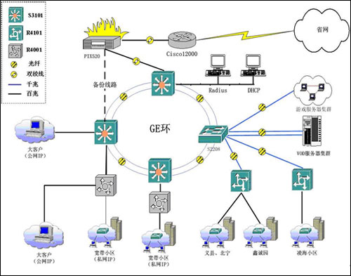 此城域網(wǎng)結(jié)構(gòu)清晰,由核心層的三層交換機(jī)只負(fù)責(zé)數(shù)據(jù)的快速轉(zhuǎn)發(fā),對(duì)業(yè)務(wù)匯聚和用戶的認(rèn)證控制任務(wù)全部由接入服務(wù)器R4000來(lái)完成。要求接入服務(wù)器支持多種認(rèn)證手段、加強(qiáng)對(duì)各類用戶實(shí)現(xiàn)不同級(jí)別的控制、為用戶的訪問(wèn)提供安全保障措施、結(jié)合Radius系統(tǒng)提供多種計(jì)費(fèi)功能。