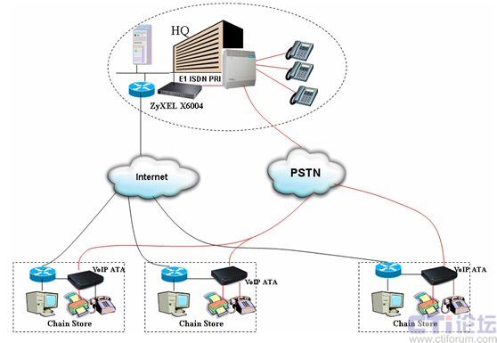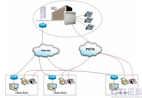 通過這種架構(gòu),各連鎖分店的話機與總部內(nèi)部話機之間的聯(lián)系便可以透過IP網(wǎng)絡(luò)進行,無須再支付任何長途通話費用。