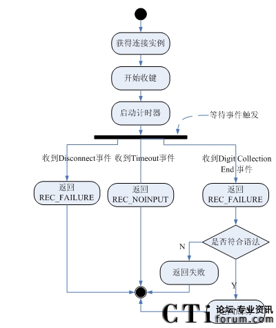 4)如果接收到SC_EVENT_DISCCONET事件,表示用戶主動放棄,返回REC_FAILURE,調(diào)用EndSession,流程結(jié)束;如果接收到SC_EVENT_TIMEOUT事件,表示用戶在計時器的時間內(nèi)沒有輸入,返回REC_NOINPUT,調(diào)用EndSession,流程結(jié)束;如果接收到SC_EVENT_DTMF_RECEIVED事件,表示用戶輸入完畢,進入下一步;