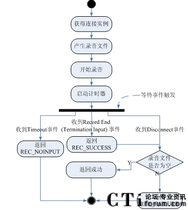 7)檢查錄音文件是否有數(shù)據(jù)。如果錄音文件沒有數(shù)據(jù)不存在數(shù)據(jù),表示錄音不成功,返回REC_FAILURE,調(diào)用EndSession,流程結(jié)束;如果錄音文件有數(shù)據(jù),表示錄音成功,返回成功,調(diào)用EndSession,流程結(jié)束。