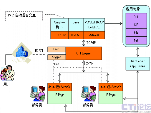 IVR部分,編寫Script++腳本程序或VC/VB/Delphi/PB/Java應(yīng)用程序控制電路的接續(xù)以及放音、錄音收碼、轉(zhuǎn)移等。