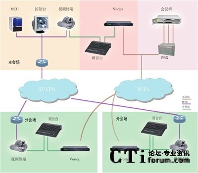 VORTEX 2241或2211與中心會場的調(diào)音臺聯(lián)結(jié)),在每個分會場根據(jù)會議規(guī)模分別配備一套POLYCOM會議電話根據(jù)會場數(shù)量配備一套相應(yīng)方數(shù)的PSTN音頻會議橋。