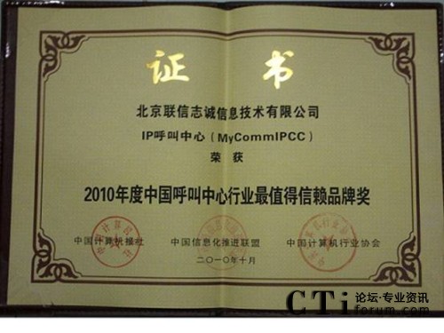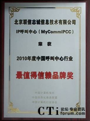CTI論壇(ctiforum)11月1日消息(記者 潘婷婷):近日,在國(guó)家信息化專(zhuān)家咨詢委員會(huì)的指導(dǎo)下,作為中國(guó)信息化發(fā)展重要推動(dòng)力量的中國(guó)計(jì)算機(jī)報(bào)社、中國(guó)計(jì)算機(jī)行業(yè)協(xié)會(huì)、中國(guó)信息化推進(jìn)聯(lián)盟等國(guó)家級(jí)權(quán)威媒體及國(guó)家信息化領(lǐng)域一級(jí)權(quán)威機(jī)構(gòu),共同組織開(kāi)展“2010中國(guó)行業(yè)信息化讀者選擇獎(jiǎng)評(píng)選”,重點(diǎn)展示信息化在行業(yè)應(yīng)用中的優(yōu)秀應(yīng)用案例、產(chǎn)品及解決方案。由中國(guó)計(jì)算機(jī)報(bào)社組織業(yè)內(nèi)專(zhuān)家,在經(jīng)過(guò)歷時(shí)3個(gè)月的產(chǎn)品征集、方案論證、專(zhuān)家評(píng)審后,北京聯(lián)信志誠(chéng)信息技術(shù)有限公司(簡(jiǎn)稱MyComm公司),其核心產(chǎn)品MyCommIPCC獨(dú)占2010年中國(guó)呼叫中心行業(yè)最值得信賴品牌獎(jiǎng)。