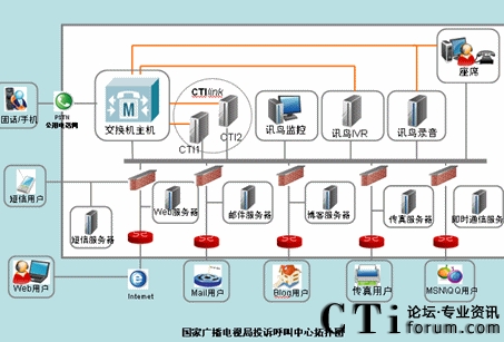 系統(tǒng)主要包含IVR服務(wù)器,CTI服務(wù)器,短信網(wǎng)關(guān),郵件服務(wù)器,傳真服務(wù)器,數(shù)據(jù)庫服務(wù)器,座席系統(tǒng)等?蛻魮艽蛱胤柎a接入廣電公司客服系統(tǒng),首先由IVR提供自動語音服務(wù)。CTI服務(wù)器負責(zé)所有的電話的路由、排隊、轉(zhuǎn)接和控制?蛻粼诮邮茏詣诱Z音服務(wù)時,如果需要人工幫助,可選擇轉(zhuǎn)入人工座席。由IVR系統(tǒng)向CTI發(fā)出轉(zhuǎn)接請求,完成轉(zhuǎn)接功能。
