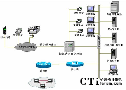 系統(tǒng)采用的硬件根據(jù)實(shí)際需求配置,如果實(shí)際接入電話容量小于30條線,系統(tǒng)與市話要采用普通模擬中繼線接入, 可選擇配置恒訊達(dá)公司HXD09的模擬板(AT0),申請(qǐng)的普通模擬中繼線需開(kāi)通來(lái)電顯示業(yè)務(wù),如電信部門不開(kāi)通項(xiàng)服務(wù),采用此種接入方式無(wú)法實(shí)現(xiàn)來(lái)電顯示功能;根據(jù)接入容量和話務(wù)員數(shù)量的總和計(jì)算卡的應(yīng)用數(shù)量,如實(shí)際接入電話容量大于等于30條線,則可采用E1接口數(shù)字中繼線接入,