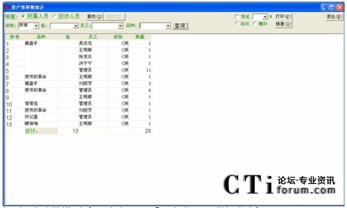 統(tǒng)計方式中含5種查詢方式:時間段、員工、產(chǎn)品、銷售、區(qū)域,可按這幾種方式進(jìn)行進(jìn)線銷售統(tǒng)計。
