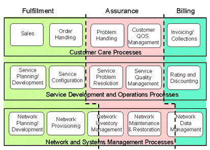 在TMF的模型中,從功能上來(lái)看,OSS主要包括三大功能:業(yè)務(wù)開(kāi)通(Service Fulfillment);業(yè)務(wù)保障(Service Assurance);計(jì)費(fèi),又稱(chēng)業(yè)務(wù)計(jì)量(Service