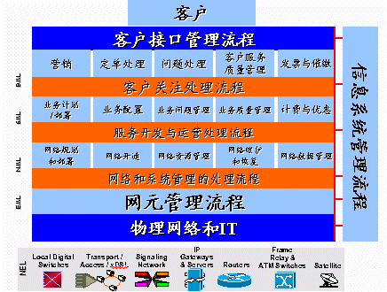 Assurance)的定義是,提供量化的測(cè)量指標(biāo),確保網(wǎng)絡(luò)服務(wù)能夠達(dá)到客戶(hù)所訂購(gòu)的要求。(Service Usage)的定義是,測(cè)量電信網(wǎng)絡(luò)中各種業(yè)務(wù)的使用情況,計(jì)算處理使用電信業(yè)務(wù)的應(yīng)收費(fèi)用,并對(duì)電信業(yè)務(wù)的收費(fèi)過(guò)程提供支持。這是從縱向的角度來(lái)看,而從橫向的角度來(lái)看,從電信管理的角度來(lái)看,OSS主要處在三個(gè)管理層面:客戶(hù)服務(wù)層;業(yè)務(wù)管理層;網(wǎng)絡(luò)管理層。